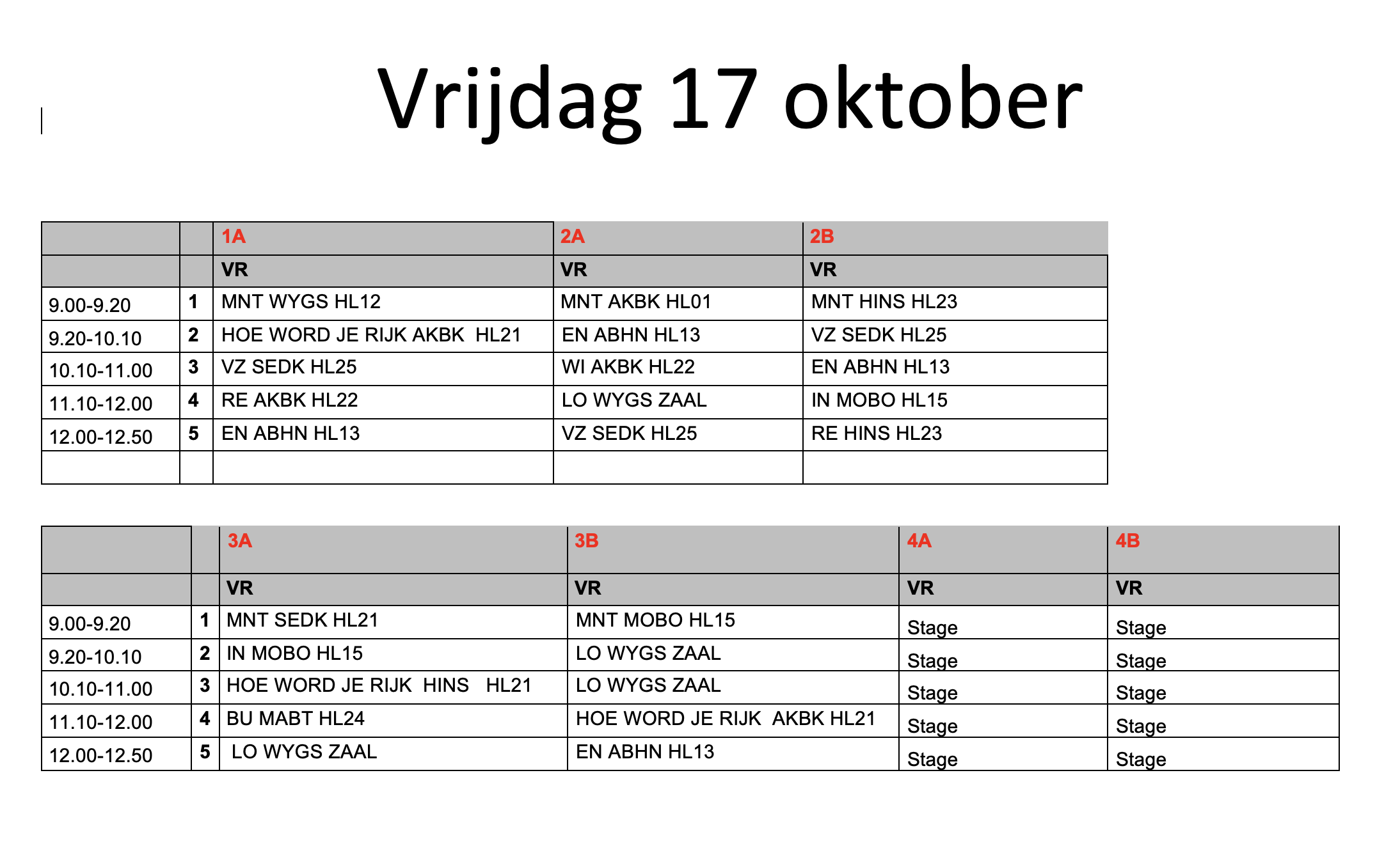 In het weekrooster kun je het rooster van elke dag zien. Maar het kan voorkomen dat er een roosterwijziging is. Deze roosterwijzigingen staan op deze pagina. Staat er GEEN roosterwijziging op deze pagina, dan kijk je dus gewoon in het weekrooster. Daar zie je welke lessen je hebt en hoe laat deze lessen gegeven worden.